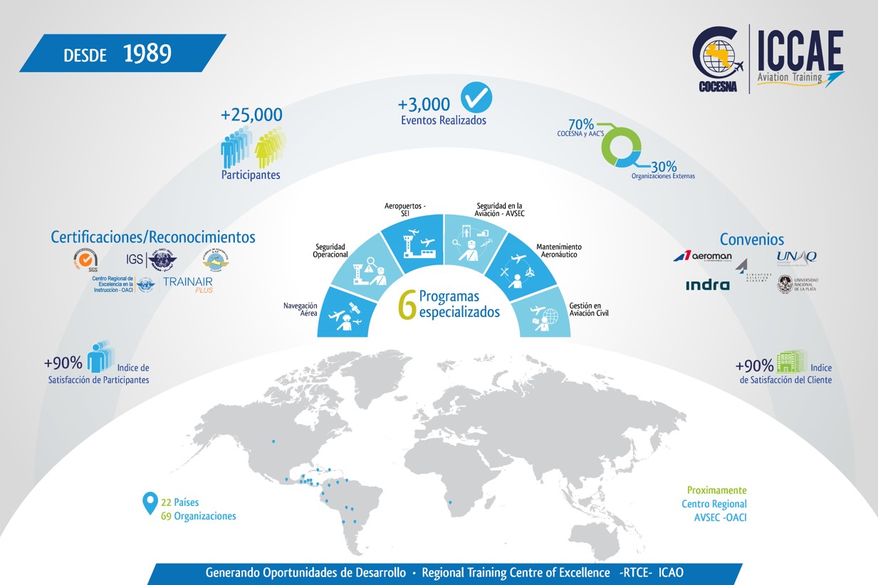 Ofrecemos soluciones de calidad en la formación y desarrollo del personal vinculado a la industria del transporte aéreo. La experiencia acumulada en actividades de entrenamiento aeronáutico se demuestra en los más de 1,800 eventos realizados y más de 20,000 participantes capacitados a la fecha, contando con representantes de organizaciones de México, Belice, Guatemala, Honduras, El Salvador, Nicaragua, Costa Rica, Panamá, Cuba, República Dominicana, Colombia, Bolivia, Ecuador, Perú, Paraguay y Venezuela, entre otros.