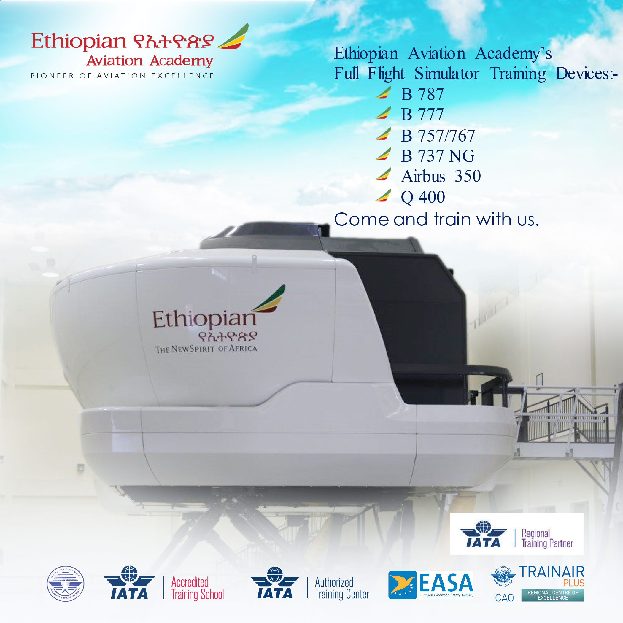 The Ethiopian Aviation University is an ICAO designated Regional Training Center of Excellence; European Aviation Safety Agency (EASA) approved Maintenance Training Organization, Authorized Training Center (ATC) and Accredited Training School (ATS) by the International Air Transport Association (IATA) and Approved Training Organization (ATO) by the Ethiopian Civil Aviation Authority. Over six decades old, the Ethiopian Airline Aviation University, the former Academy, is a world class Aviation Training Center equipped with state of the art and best in class training equipment and technology offering full range of Aviation Training Programs such as basic (Beginner), ab initio courses, full flight simulator, regulatory body and other specialization trainings to mention a few.